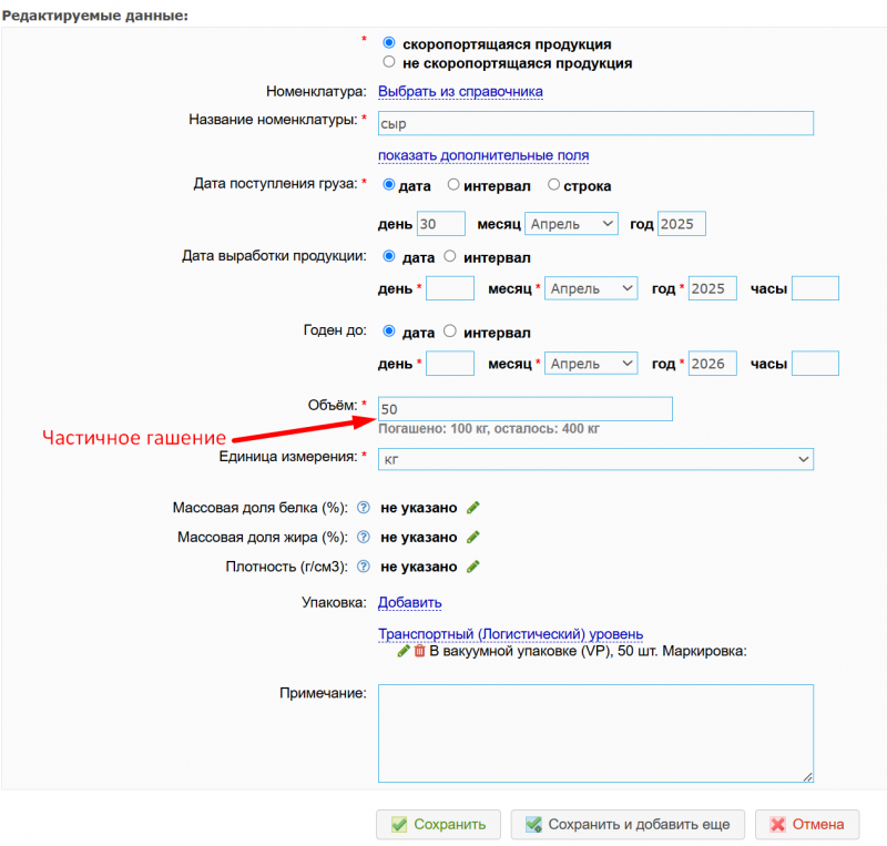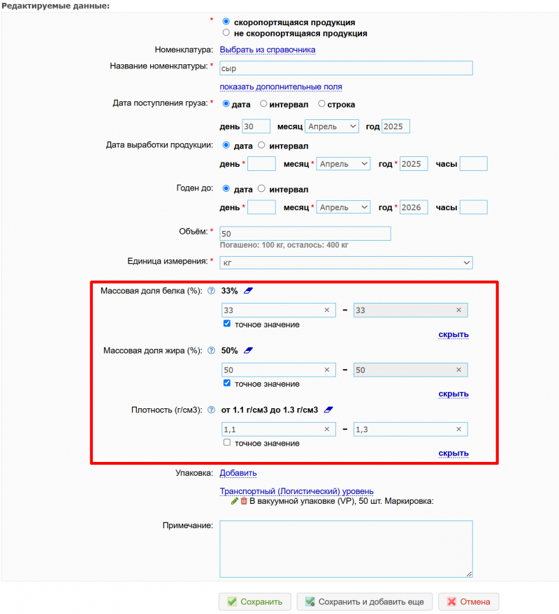 - Для продукции, поступившей из Республики Беларусь, качественные характеристики могут быть уже заполнены. В таком случае сведения о массовых долях белка и жира отредактировать невозможно.