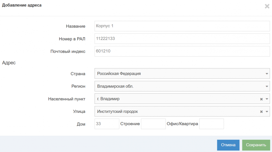 Рис. 3. Заполнение адреса отдела (09.07.2020: Версия 2.40.0)