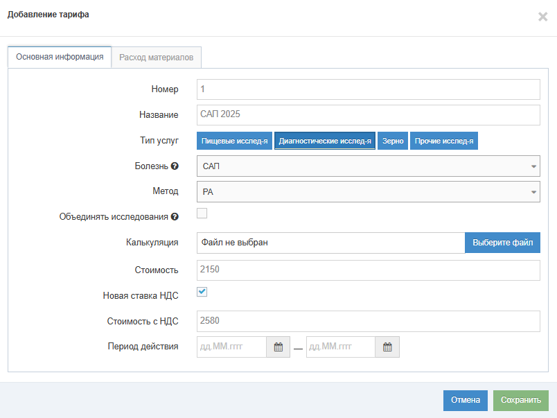 - В появившейся форме «Добавление тарифа» внести информацию о тарифе. Данная форма состоит из двух вкладок: