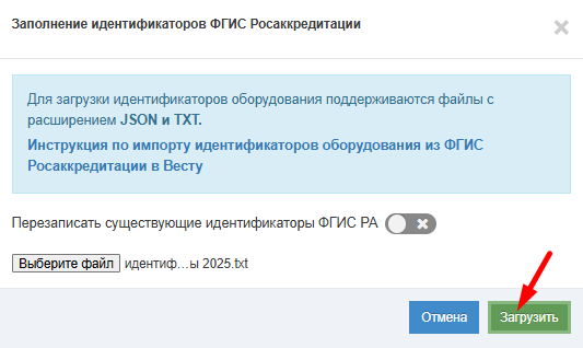 Загрузка идентификаторов ФГИС РА в разделе «Оборудование» подсистемы «Веста.Настройка» позволяет сопоставить информацию об оборудовании из реестра ФГИС РА с оборудованием в компоненте «Веста».