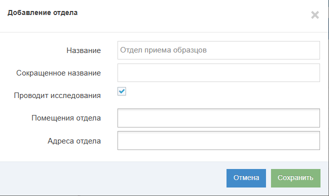 По умолчанию у каждой лаборатории создается отдел с названием «Тестовый». С помощью кнопки «Добавить» на странице «Перечень отделов» можно создать новую запись отдела учреждения. При нажатии на данную кнопку появится форма «Добавление отдела» (рис. 8), в которой только одно обязательное поле для заполнения - Название. При установки галочки напротив надписи Проводит исследования появится поле Помещения отдела для указания сведений о помещении для проведения исследования.