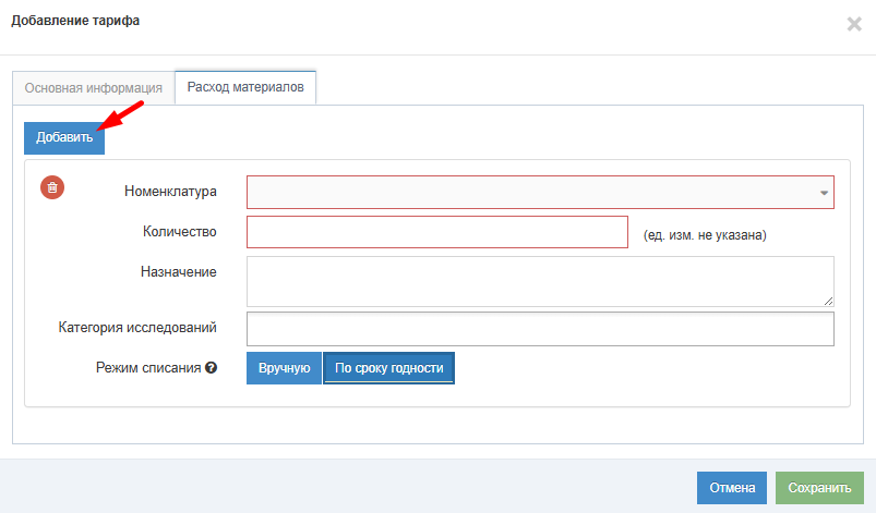 - Расход материалов - в данной вкладке можно указать материал, который используется при оказании услуг по тарифу. При нажатии на кнопку «Добавить» (рис. 27) появятся следующие поля для заполнения: