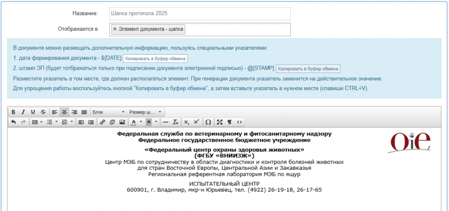 - выпадающий список с элементами документа (Шапка, Подвал, Примечание, Утверждение) напротив надписи Отображается в;