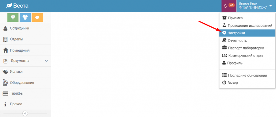 - Осуществить вход в подсистему «Веста.Настройки», перейдя в соответствующий раздел в правом верхнем углу системы (рис. 1).