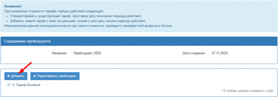 - На странице просмотра информации о прейскуранте нажать на кнопку «Добавить» (рис. 24) для создания группы тарифа. В появившейся форме заполнить обязательные для заполнения поля Номер и Наименование, после чего нажать на кнопку «Сохранить».