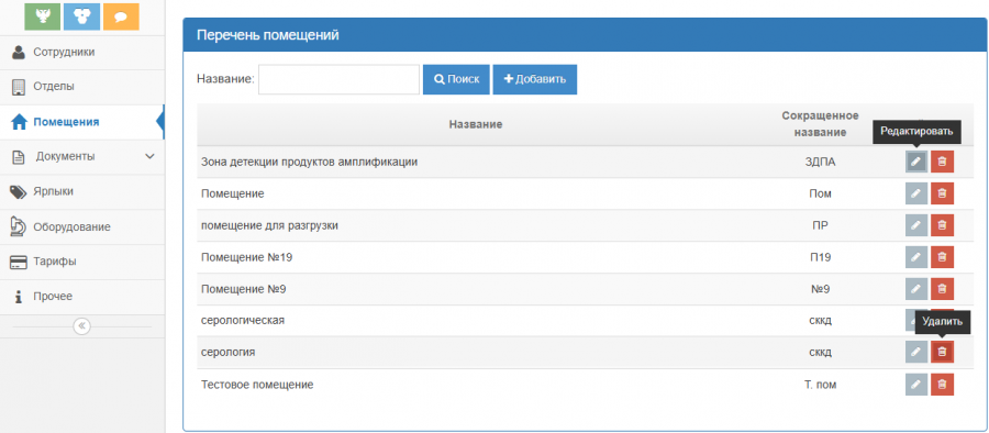 Чтобы отредактировать или удалить помещение из списка нажмите соответствующую кнопку с пиктограммой в столбце Действия напротив нужной записи.