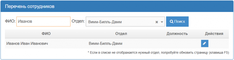- ФИО - текстовое поле для ввода ФИО сотрудника полностью или частично;