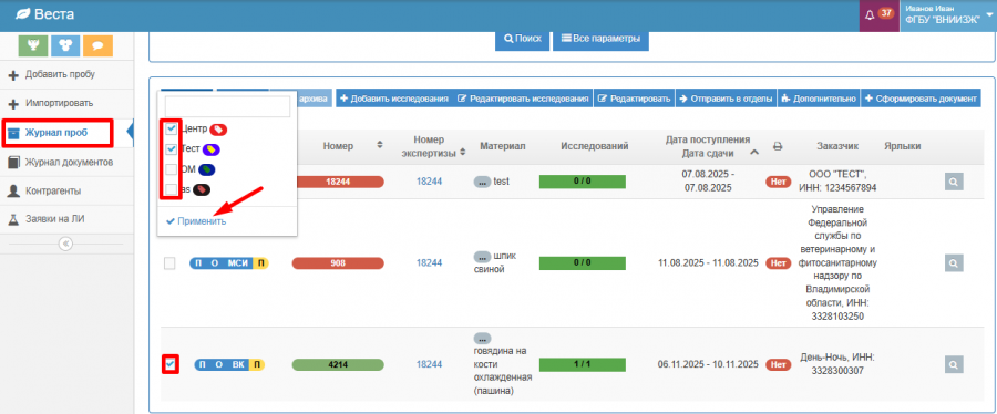 - Перейти в раздел «Журнале проб» подсистемы Веста.Приемка.