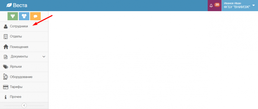 Раздел «Сотрудники» в подсистеме «Веста.Настройки» предназначен для управления списком сотрудников, их распределением по отделам и присвоением ролей. Для перехода в данный раздел необходимо выбрать в боковой панели одноименный пункт меню (рис. 2).