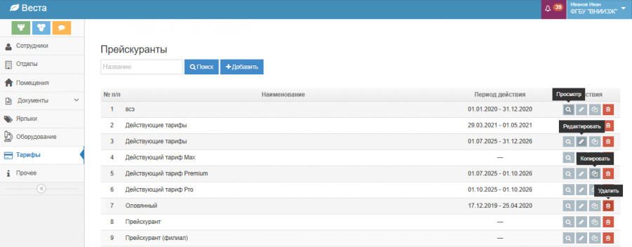 Раздел «Тарифы» в подсистеме «Веста.Настройки» служит для описания оказываемых услуг. Тарифы в этой подсистеме разбиваются на прейскуранты, которые представлены в виде иерархической структуры. Прейскурант необходимо добавить перед добавлением самих тарифов. При переходе в данный раздел появляется страница со списком прейскурантов (рис. 23). Запись прейскуранта можно открыть на просмотр для добавления в него тарифов, редактировать, копировать для создания новой записи прейскуранта, удалить.