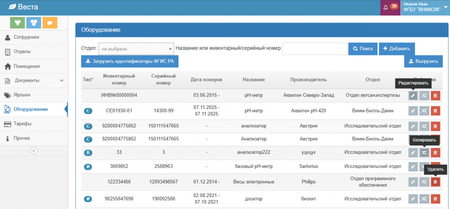 Раздел «Оборудование» в подсистеме «Веста.Настройки» предназначен для ведения учета и контроля лабораторного оборудования, используемого в учреждении. При переходе в данный подраздел откроется страница «Оборудование» с полным списком оборудования (рис. 20).
