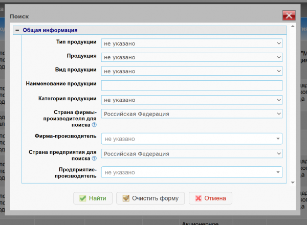 Остальные параметры, значения которых указываются в простом текстовом поле, являются не строгими, т.е. поиск по ним осуществляется по указанной подстроке. Например, если в форме поиска в поле «Наименование продукции» было указано значение «говядина», то в результат поиска могут попасть записи с такими названиями: говядина бескостная охлажденная, говядина бескостная мор., и т.п. - Нажмите на кнопку «Найти». В результате форма поиска закроется и откроется результирующий список.
