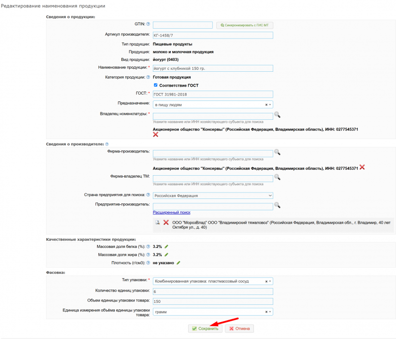 - Внесите необходимые изменения в редактируемые сведения на открывшейся странице редактирования наименования продукции.