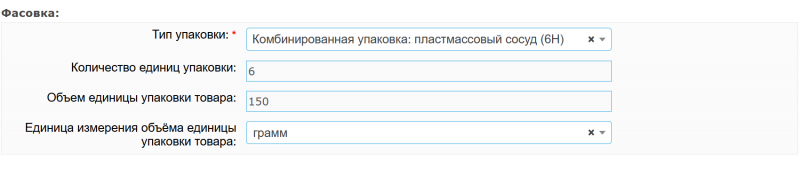 - 5. В блоке «Фасовка» (рис. 4) внесите сведения об упаковке, используемой для распределения весового товара на розничные порции: тип упаковки, количество единиц упаковки, объем единицы упаковки товара, единица измерения объёма единицы упаковки товара. Например, при добавлении в справочник номенклатуры наименования продукции «творог 5%» весом 200 грамм, упакованный в вакуум, в фасовке необходимо указать: тип упаковки — в вакуумной упаковке (VP), количество единиц упаковки — 1, объем единицы упаковки товара — 200, единица измерения объёма единицы упаковки товара — грамм. Другой пример, 1 коробка вмещает 24 единицы товара, тогда необходимо указать: тип упаковки — коробка (BX), количество единиц упаковки — 24, объем единицы упаковки товара — 1, единица измерения объёма единицы упаковки товара — шт.