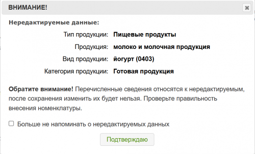 | Примечание. 1. Если категория продукции «Не указано»/«Не классифицировано», то при изменении такой номенклатуры возможно изменить категорию и задать качественные характеристики для молочной продукции.