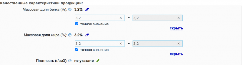 - Для этого перейдите в режим редактирования (пиктограмма «зеленый карандаш») и внесите значения в поля «Массовая доля белка» и/или «Массовая доля жира» одним из доступных способов указания (рис. 3):