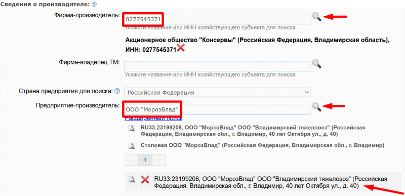 - 3.1. В поле «Фирма-производитель» внесите ИНН или название (с учетом кавычек и аббревиатур) организации, которая осуществляет производственную деятельность, нажмите на кнопку поиска (пиктограмма «лупа») и выберите организацию из выпадающего списка.