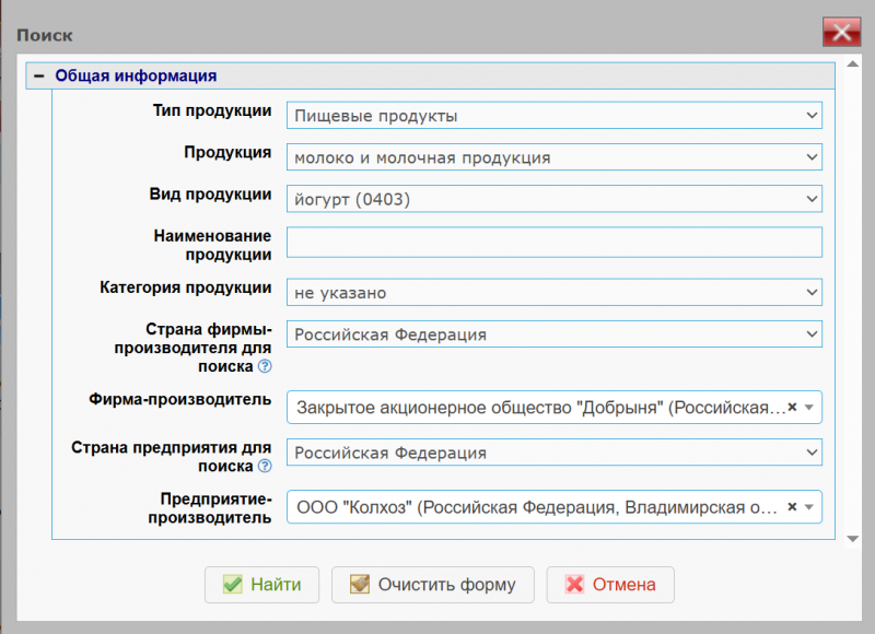 Остальные параметры, значения которых указываются в простом текстовом поле, являются не строгими, т.е. поиск по ним осуществляется по указанной подстроке. Например, если в форме поиска в поле «Наименование продукции» было указано значение «говядина», то в результат поиска могут попасть записи с такими названиями: говядина бескостная охлажденная, говядина бескостная мор., и т.п.