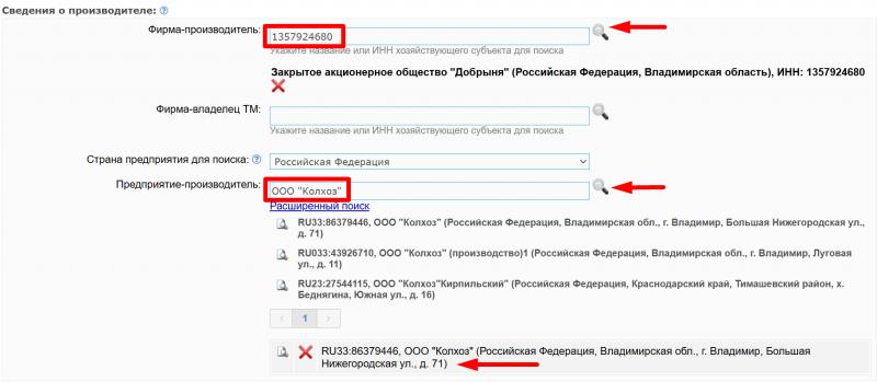 3.1. В поле «Фирма-производитель» внесите ИНН или название (с учетом кавычек и аббревиатур) организации, которая осуществляет производственную деятельность, нажмите на кнопку поиска (пиктограмма «лупа») и выберите организацию из выпадающего списка.
