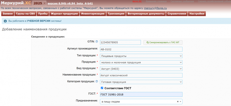 Рис. 1. Внесение сведений о продукции при добавлении номенклатуры в справочник предприятия в подсистеме «Меркурий.ХС» (29.09.2025 Версия: 6.93)