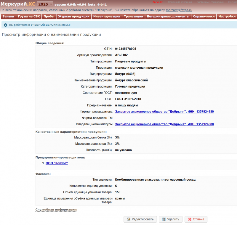 Рис. 7. Просмотр информации о наименовании продукции в подсистеме «Меркурий.ХС» (29.09.2025 Версия: 6.93)