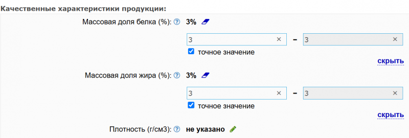 Для этого перейдите в режим редактирования (пиктограмма «зеленый карандаш») и внесите значения в поля «Массовая доля белка» и/или «Массовая доля жира» одним из доступных способов указания (рис. 3):