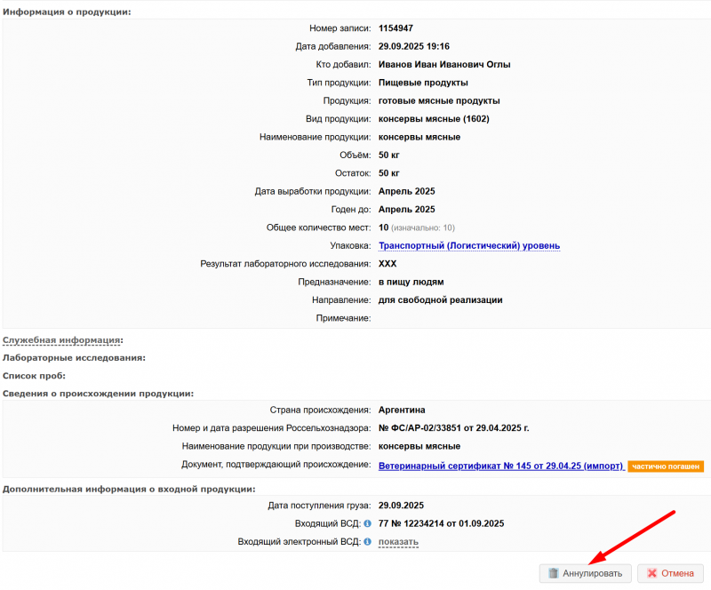 - Нажмите на кнопку «Аннулировать» на странице просмотра сведений о записи входного журнала (рис. 3).