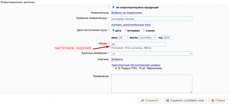 - 6.1. В поле «Дата поступления груза» внесите дату поступления груза (по умолчанию в поле устанавливается текущая дата);