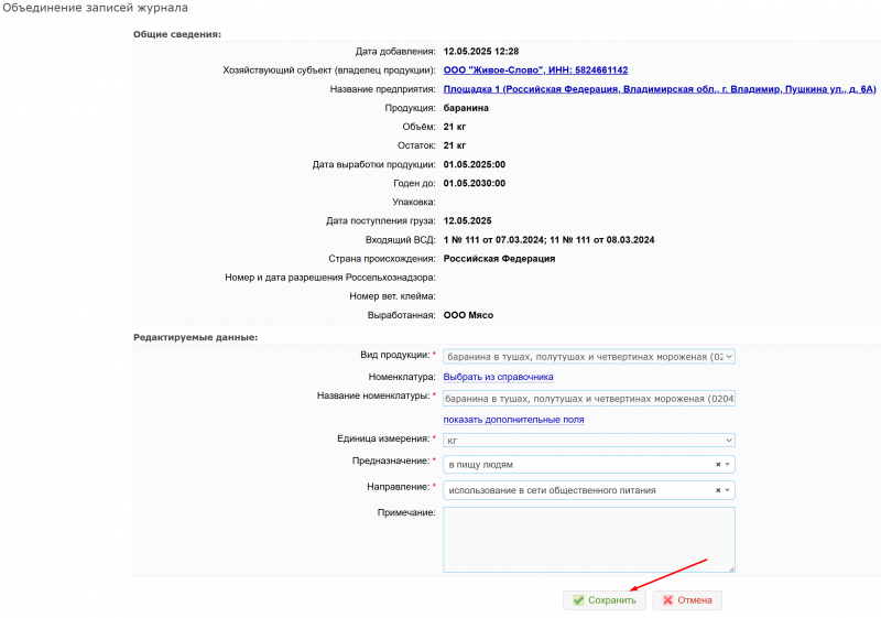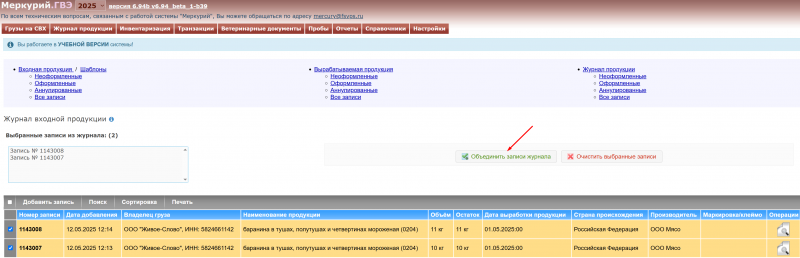 Объединение записей складского журнала продукции в Меркурий.ГВЭ