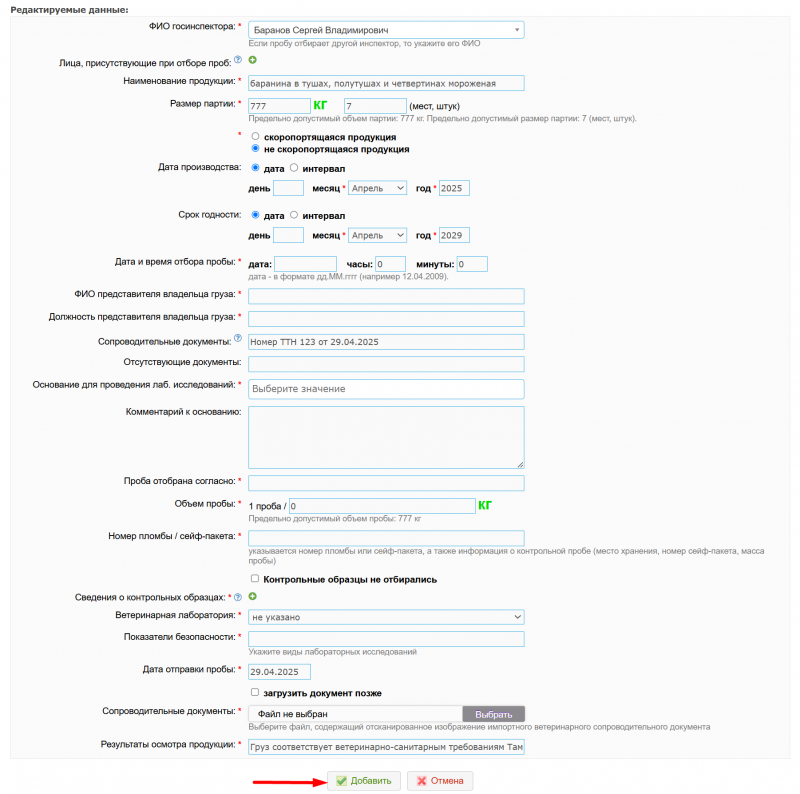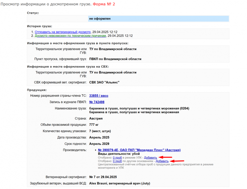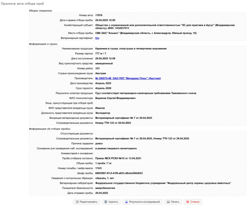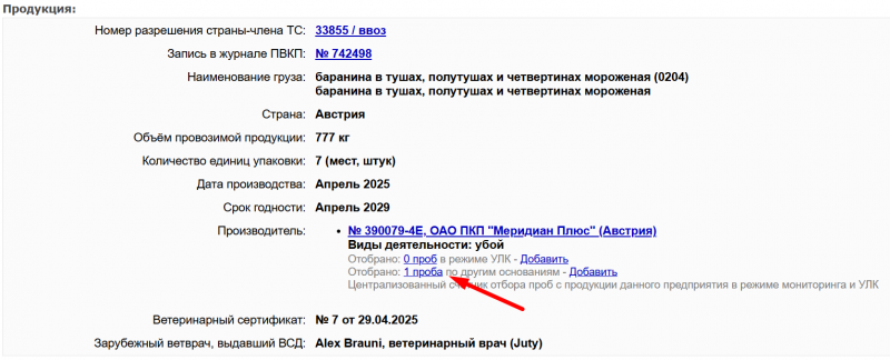 - оформлен акт отбора проб и привязан к определенному ветеринарному сертификату;