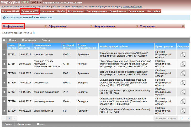 - Запись журнала должна быть в состоянии «груз поступил на СВХ», ветеринарный документ в состоянии «не оформлен».