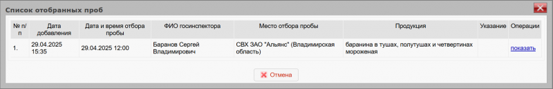 - акт отбора проб удален без дальнейшей возможности поиска и просмотра в списке проб раздела «Пробы»;