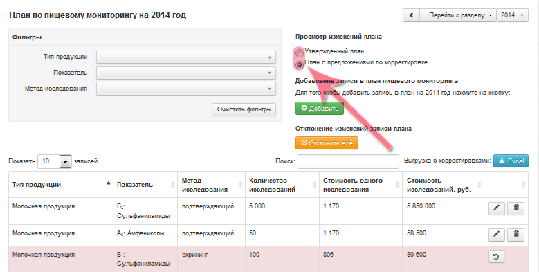 При переходе в раздел "План мониторинга" по умолчанию открывается страница с утвержденным планом по пищевому мониторингу на текущий год (рис. 1). На данной странице пользователю доступны следующие функции: