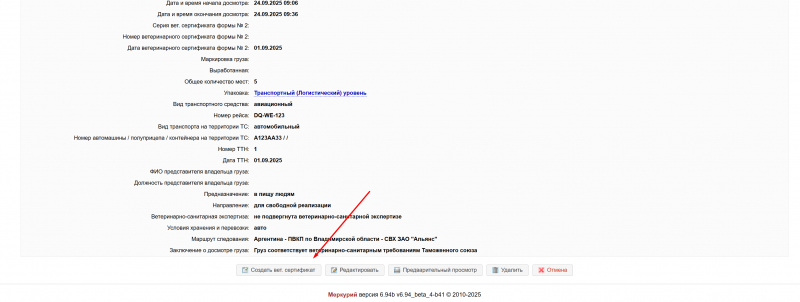 - 4. На странице просмотра информации о досмотренном грузе нажать внизу кнопку «Создать вет. сертификат» (рис.12).