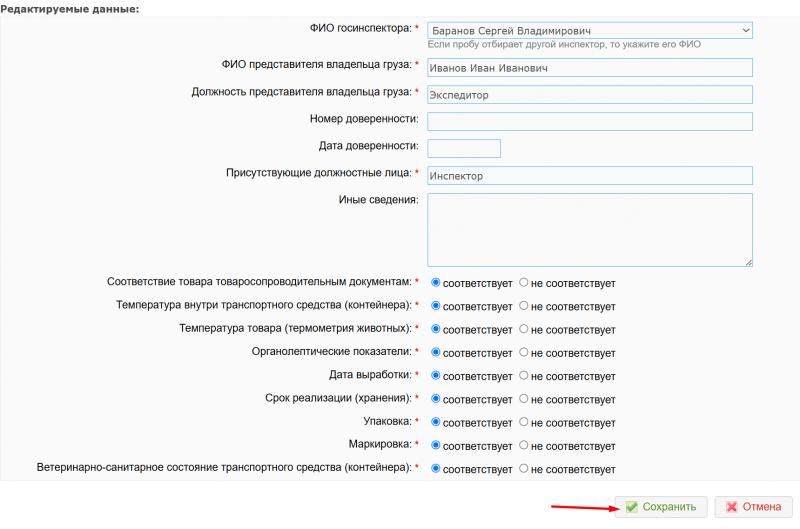 - На открывшейся странице «Сведения об акте ветеринарно-санитарного досмотра» укажите все необходимые данные и нажмите на кнопку «Сохранить» (рис. 5).