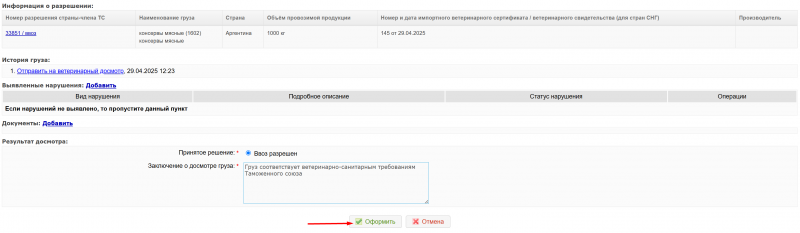 - На открывшейся странице «Принятие решения по грузу по результатам ветеринарного контроля» можно добавить выявленные нарушения и прикрепить документы: