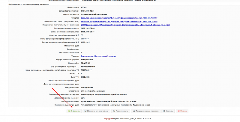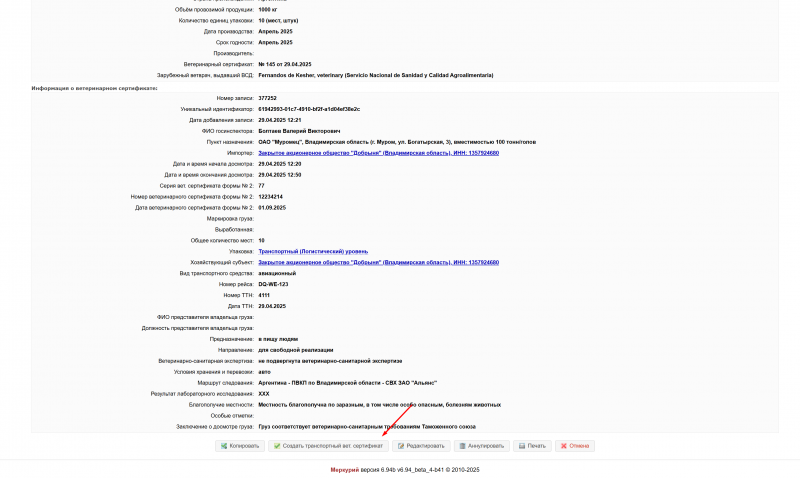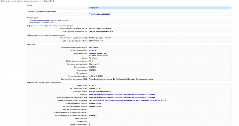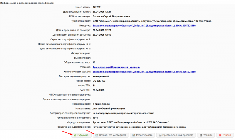 - В результате откроется страница «Просмотр информации о досмотренном грузе. Форма № ...», где следует проверить данные и перейти к оформлению ветеринарного сертификата.