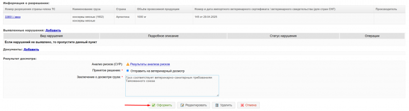 - 6. На странице просмотра информации о досмотренном грузе нажать внизу кнопку «Оформить» (рис.14).