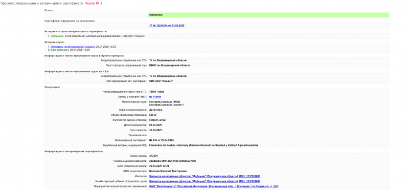 - Сформирован ветеринарный сертификат на импортную продукцию, который доступен в разделе «Грузы на СВХ».