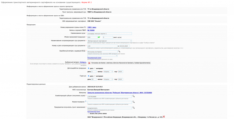 Ветеринарный сертификат создается на основании записи журнала ПВКП. Все сведения, указанные при досмотре на пункте пропуска, переносятся в ветеринарный сертификат, причем часть из них инспектор может отредактировать. Для оформления груза выполните следующие действия: