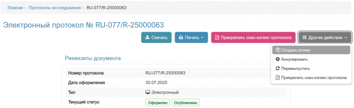 - «Перевыпустить» - при нажатии открывается страница «Перевыпуск протокола», где предзаполнены данные во всех блоках.