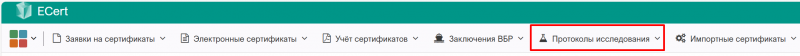 - После успешного входа в систему перейти в раздел главного меню «Протоколы исследований» (Рис. 1).