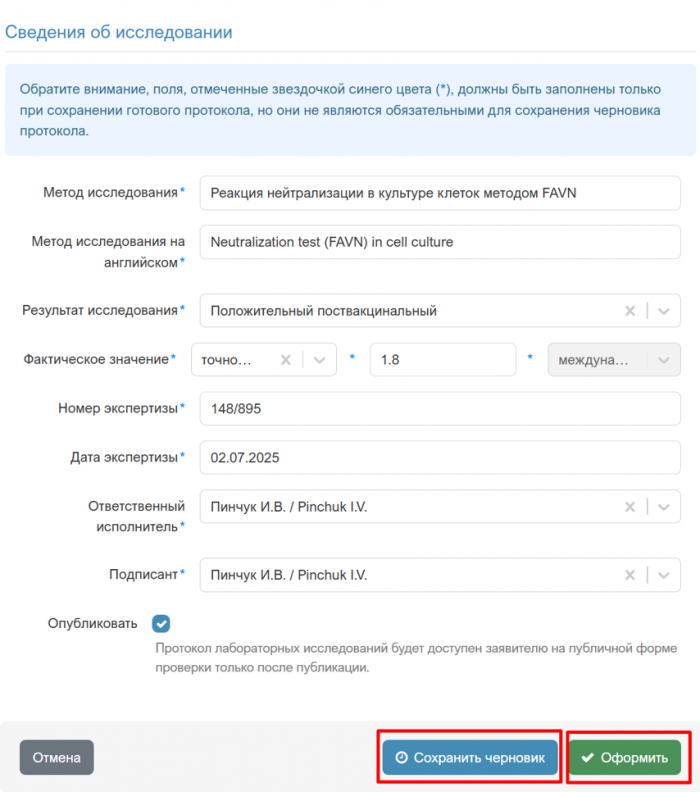 - «Опубликовать»* – чекбокс по умолчанию включен. Протокол лабораторных исследований будет доступен заявителю на публичной форме проверки только после публикации.
