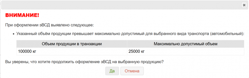 При попытке оформления транспортного эВСД на продукцию, объем которой превышает установленные максимальные значения в заданной единице измерения для выбранного вида транспорта в транзакции, также появится модальное окно с соответствующим предупреждением. Предупреждение содержит следующее сообщение: «Указанный объём продукции превышает максимально допустимый для выбранного вида транспорта».