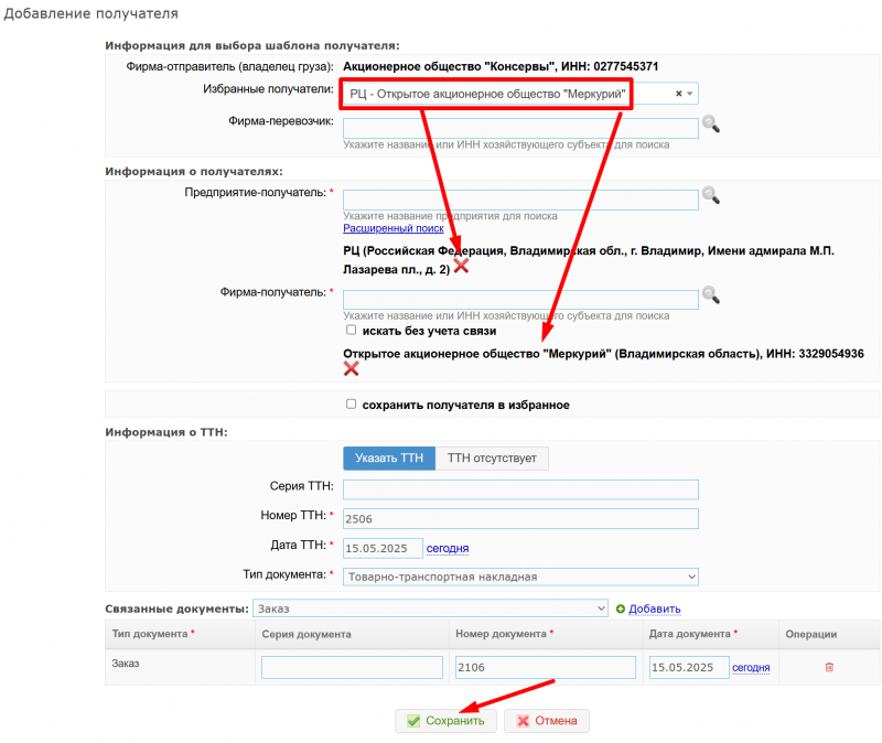 Рис. 3. Добавление получателя в созданную транзакцию в подсистеме «Меркурий.ГВЭ» (12.05.2025: Версия: 6.94)