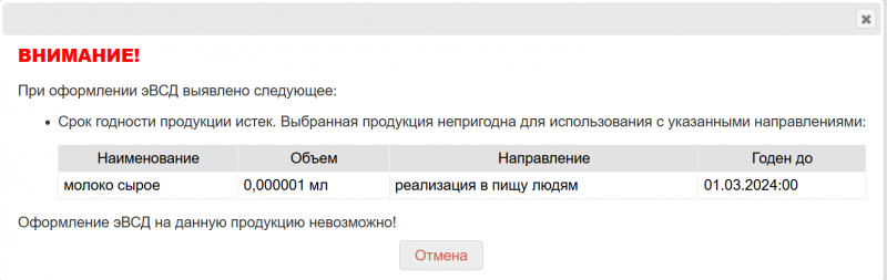 Если в качестве перевозимой продукции добавлена запись журнала с истекшим сроком годности, при попытке оформления эВСД на такую продукцию с целями, которые нельзя использовать для некачественного груза, появится модальное окно с информационным сообщением о невозможности оформления эВСД. Предупреждение содержит следующее сообщение: «Срок годности продукции истек. Выбранная продукция непригодна для использования с указанными целями: наименование продукции, объем и единицы измерения, цель, срок годности. Оформление эВСД на данную продукцию невозможно!».