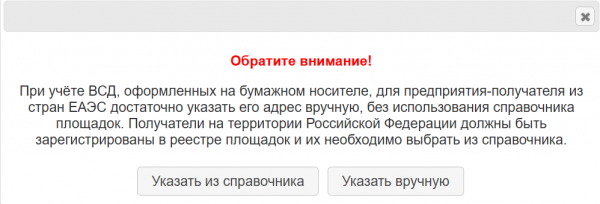 - 5.2. В результате появится форма, на которой предлагается два способа добавления получателя в транзакцию для учёта ВСД, оформленного на бумажном носителе — указать получателя из справочника или указать получателя вручную:
