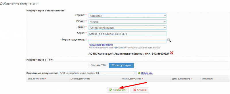 - При указании сведений вручную на странице добавления получателя выберите страну ТС, регион страны ТС, район региона и укажите адрес места назначения. В поле «Фирма-получатель» выполните поиск по ИНН и выберите хозяйствующий субъект из реестра. Если ХС найти не удается, необходимо зарегистрировать в разделе «Настройки», подразделе «Справочники»